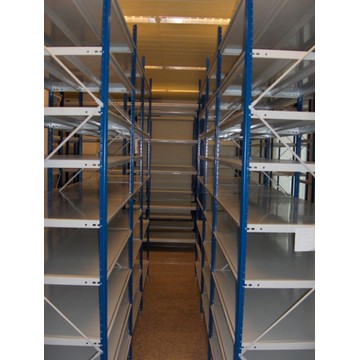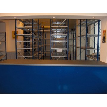 La caratteristica principale di questo tipo di scaffale sono i ripiani a manto intero inseriti a scomparsa nei correnti.